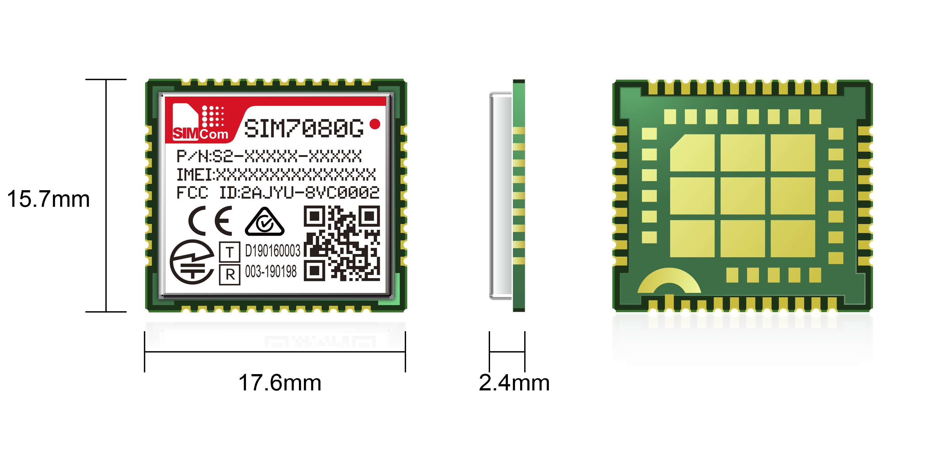 General Features Support Bands: CAT-M: B1/B2/B3/B4/B5/B8/B12/B13/B14/B18/B19/B20/B25/B26 /B27/B28/B66/B85 CAT-NB: B1/B2/B3/B4/B5/B8/B12/B13/B18/B19/B20/B25/B26/B28 /B66/B71/B85 LTE RF Power Class: 5 (Typ. 21dbm) Control Via AT Commands Supply voltage range: 2.7V-4.8V Operation temperature: -40°C to +85°C Dimensions: 17.6 X 15.7 X 2.4 mm Weight: 1.4g±0.2g Date Cat-M: Uplink: 1119Kbps Downlink:589Kbps NB-IoT: Uplink: 150Kbps Downlink:136Kbps | Other Features TCP/UDP HTTP/HTTPS/TLS/DTLS/PING/LWM2M/COAP/MQTT Ayla Cloud Firmware update via USB FOTA EAT Interfaces UART SIM card PCM/I2S/SPI I2C GPIO ADC USB Embedded SIM (optional) | Consumption PSM: 3.2uA Sleep: 0.6mA @PTW=40.96s eDRX=81.92s Idle: 10mA Certifications(plan) RoHS\REACH\JATE\Telec\Docomo\KDDI\Softbank\RCM\CE(RED)\GCF\Deutsche Telekom\FCC\PTCRB\AT&T\Verizon\T-Mobile\US Cellular |